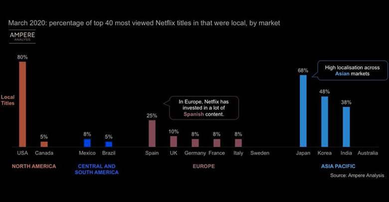 “In most of their markets, less than 10% of catalogues are locally-originated; however, in some countries, government regulations, quotas and the impact of foreign OTT platforms are driving the trend to localisation. And looking ahead at in-production titles for Netflix, for example, over 50% of all new movies and series will be produced outside the US.”