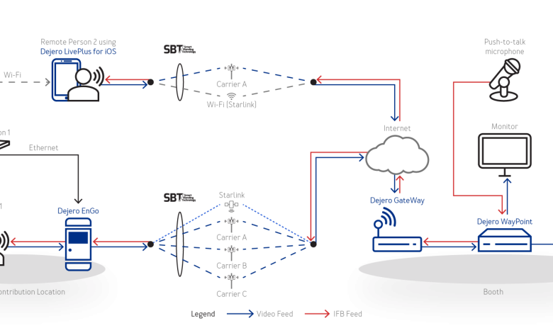Reliable internet backhaul will be provided by a Dejero GateWay network aggregation device, sending the video signals to a Dejero PathWay encoder via a WayPoint receiver located in a simulated ‘production environment’.Both the EnGo 3 and LivePlus App are equipped with IFB to provide one-way voice communication from a ‘director” at the ‘hub’ to the reporters on the Strip.